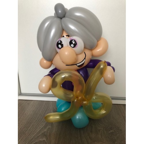 Dit ballonfiguur als dame heeft de leeftijd van 96 jaar in haar handen.