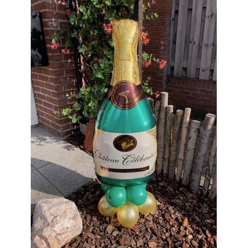 Deze grote champagne fles van folieballonnen staat op een ballonvoet.