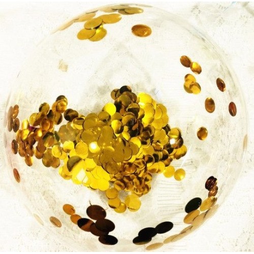 Deze doorzichtige bubble ballon heeft gouden confetti (1cm) als decoratie en is 15 cm groot.