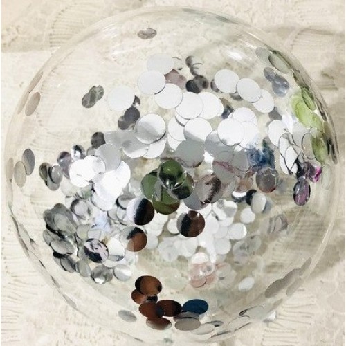 Deze doorzichtige bubble ballon heeft zilveren confetti (1cm) als decoratie en is 15 cm groot.