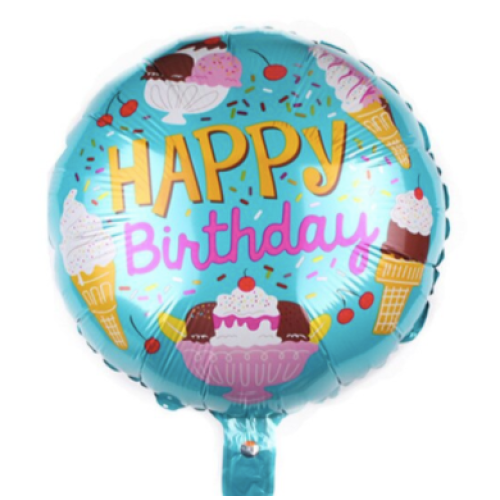 Deze Happy Birthday folieballon heeft heerlijke ijsjes als afbeeldingen erop staan.