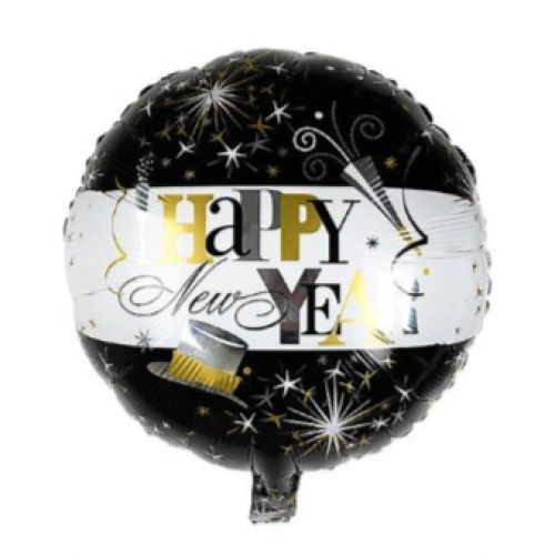 Een ronde folie ballon voor oud en nieuw met de tekst : Happy new Year.