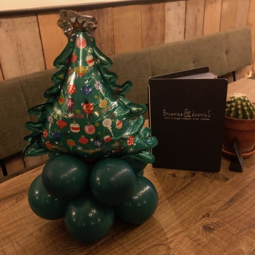 Deze kerstboom op een ballonvoetje als tafelversiering is leuk om de kerstsfeer naar binnen te halen.