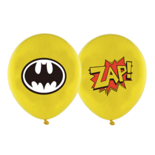 Deze ballonnen zijn aan twee kanten bedrukt, op de ene kant staat het logo van Batman zelf en aan de andere kant het cartoon plaatje Zapp.