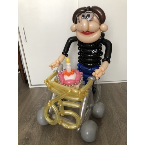 Ballonfiguur Viering Verjaardag Sarah met rollator en taart