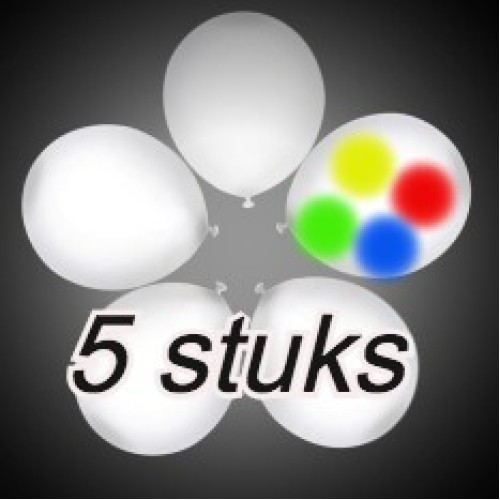 Deze set bevat 5 witte latex ballonnen met daarbij 5x kleuren LED lampjes wat in de ballon gedaan kan worden.